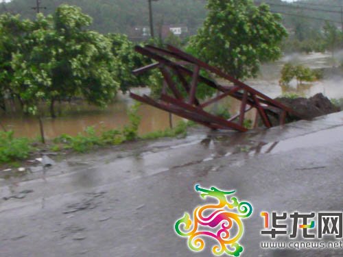 在垫江县桂溪乡石岭村,记者看到,一座横跨在河两岸的桥已被完全淹没,而平时,该桥离河面的垂直距离达6米左右。 路边瓦房上的瓦片,被大风刮走;桂溪乡一厂房内堆放的几十吨水泥,全部在大雨中报废。