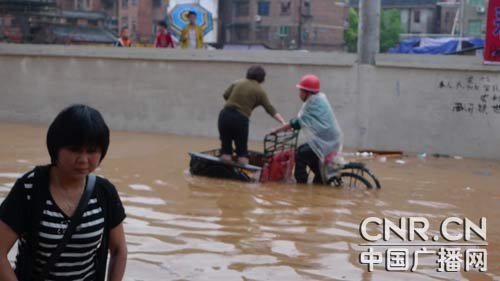 5月6日,群众在湖南省娄底市新化县城天华南路因暴雨严重积水成河的街道行走 。