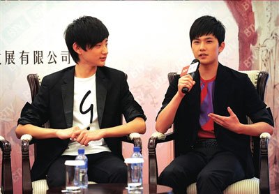 大小宝玉的扮演者杨洋(右)和于晓彤。本报记者王俭摄