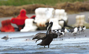 一只身上沾满油污的鹈鹕。