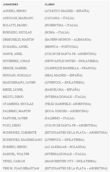 前锋:伊瓜因(皇家马德里)、梅西(巴塞罗那)、米利托(国际米兰)、帕勒莫(博卡青年)、特维斯(曼城)、阿奎罗(马德里竞技)