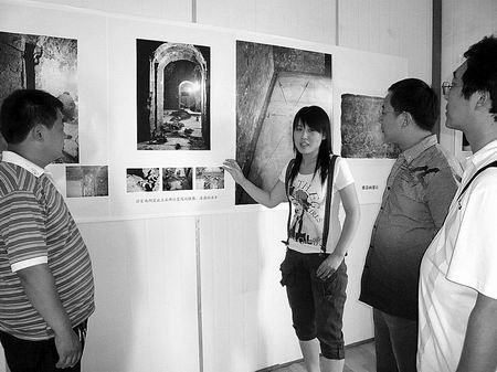 讲解员在新建曹操高陵临时展厅为客人讲解