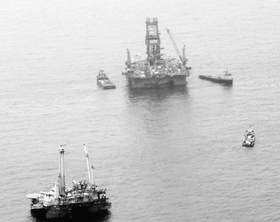 从美国海岸警卫队的“海洋哨兵”巡逻机尾舱往下看,墨西哥湾大片大片的浮油随着波浪起伏,在阳光下折射出奇异的色彩。一艘艘船只拖着浮标在搜集海面油污。飞临漏油“原点”海面,可以看到一个巨大的海上作业平台,它仍在抽取水下漏油。(见上图,本报记者管克江摄)英国石油公司首席执行官托尼·海沃德6月6日表示,漏斗状装置成功“盖住”海底漏油油井之后,公司每天已经能够收集泄漏原油大约1万桶。