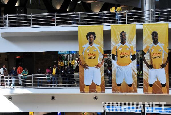 随着世界杯开幕时间临近,主办国南非各地的世界杯气氛日渐浓厚。在开幕式和闭幕式的主办城市约翰内斯堡的主干道两侧及机场随处可见大量世界杯主题广告、宣传材料以及各参赛国家和地区的旗帜。2010年世界杯足球赛将于6月11日在南非拉开战幕。图为约翰内斯堡国际机场内悬挂的巨幅世界杯宣传广告。(摄于6月4日) 新华社记者徐速绘摄