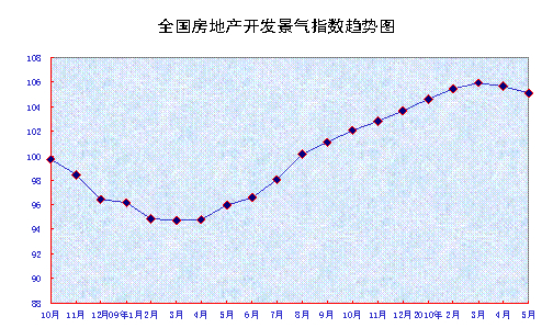 5月份,全国房地产开发景气指数(简称“国房景气指数”)为105.07,比4月份回落0.59点,比去年同期提高9.13点。