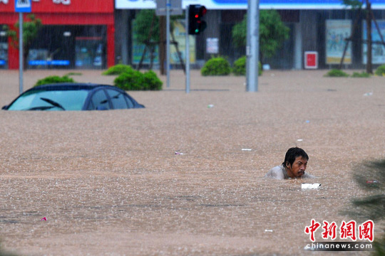 6月9日,广西重点防洪城市梧州遭遇了四年来最严重的一次内涝,导致梧州新兴二路两广市场加油站附近路段交通全部瘫痪。在两广市场附近,多辆汽车被困于水中。图为一被困市民游水逃生。 中新社发 何鎏 摄