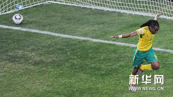 6月11日,南非队球员西·沙巴拉拉打入本届世界杯首粒进球后欢呼庆祝。当日,2010南非世界杯揭幕战在约翰内斯堡举行,东道主南非队迎战墨西哥队。新华社记者李尕摄
