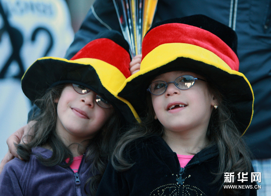 6月13日,在德国萨尔州首府萨尔布吕肯小镇的足球世界杯露天放映场上,一对双胞胎小球迷观看比赛。当天,德国队首战澳大利亚队,平日里宁静的德国小镇也到处可见欢呼的球迷和迎风飘扬的为德国队加油的国旗。新华社记者罗欢欢摄