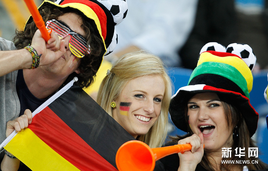 6月13日,三名球迷在比赛前。当日,在德班进行的2010年南非世界杯D组首轮比赛中,德国队对阵澳大利亚队。