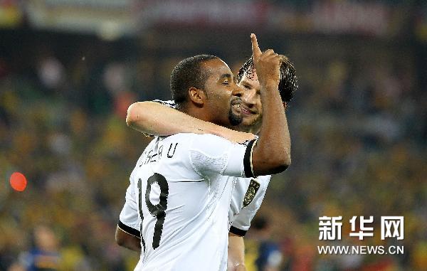 6月13日,德国队球员卡考(左)进球后与队友庆祝。当日,在德班进行的2010年南非世界杯D组首轮比赛中,德国队以4比0战胜澳大利亚队。新华社记者廖宇杰摄