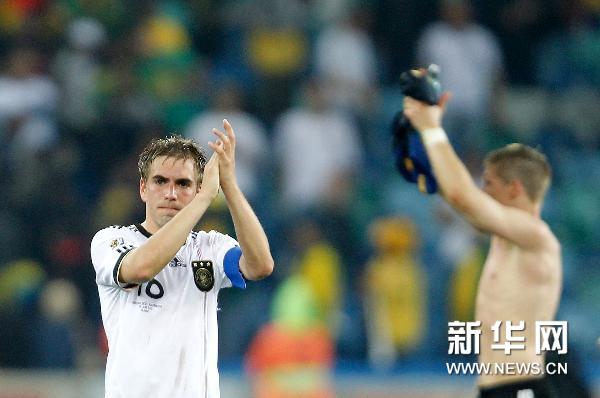 6月13日,德国队球员拉姆(左)在比赛结束后向观众致意。当日,在德班进行的2010年南非世界杯D组首轮比赛中,德国队以4比0战胜澳大利亚队。新华社记者廖宇杰摄