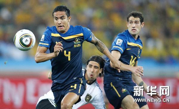 6月13日,澳大利亚队球员卡希尔(左)在比赛中带球突破。当日,在德班进行的2010年南非世界杯D组首轮比赛中,德国队以4比0战胜澳大利亚队。新华社记者廖宇杰摄