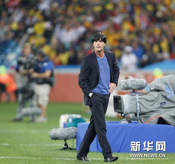 6月13日,德国队主教练勒夫在场边观战。当日,在德班进行的2010年南非世界杯D组首轮比赛中,德国队以4比0战胜澳大利亚队。新华社记者廖宇杰摄