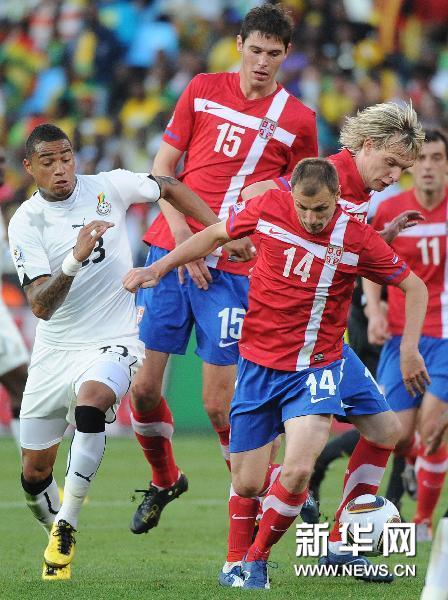 6月13日,塞尔维亚队球员米兰·约万诺维奇(前)在比赛中带球突破。当日,在茨瓦内举行的2010年南非世界杯D组比赛中,塞尔维亚队0:1负于加纳队。新华社记者李尕摄