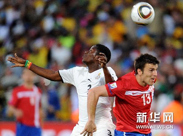 6月13日,加纳队球员吉安(左)与塞尔维亚队球员亚历山大·卢科维奇在比赛中争顶头球。当日,在茨瓦内举行的2010年南非世界杯D组比赛中,加纳队以1比0战胜塞尔维亚队。新华社记者李尕摄