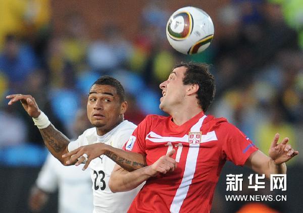 6月13日,加纳队球员凯文·博阿滕(左)与塞尔维亚队球员内纳德·米利亚什在比赛中争顶头球。当日,在茨瓦内举行的2010年南非世界杯D组比赛中,加纳队以1比0战胜塞尔维亚队。新华社记者李尕摄