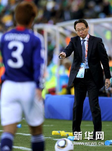 6月14日,日本队主教练冈田武史(右)在场边指挥比赛。当日,在布隆方丹举行的2010年南非世界杯E组的一场比赛中,喀麦隆队0比1不敌日本队。新华社记者郭勇摄
