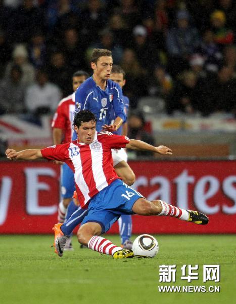 6月14日,巴拉圭队球员里韦罗(下)与意大利队球员马尔基西奥拼抢。当日,在开普敦绿点球场举行的2010南非世界杯F组比赛中,意大利队1比1战平巴拉圭队。新华社记者邢广利摄