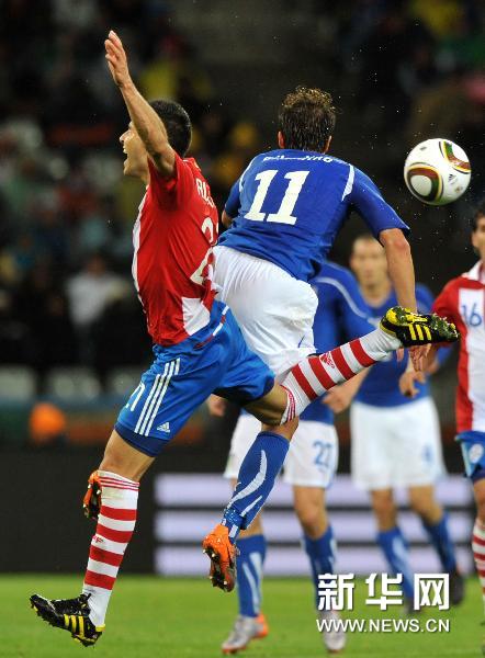 6月14日,意大利队球员吉拉迪诺(右)与巴拉圭队球员博瓦迪利亚拼抢。当日,在开普敦绿点体育场进行的2010南非世界杯F组首场比赛中,意大利队与巴拉圭队战成1比1平。新华社记者杨磊摄