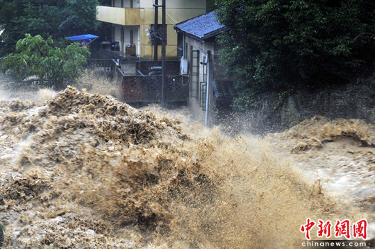 6月14日,福建南平西芹镇,山洪肆虐,涌向民房。这二日延平区降特大暴雨,强降雨导致延平、顺昌等地多处出现山体滑坡、泥石流等地质灾害。中新社发 柳涛 摄