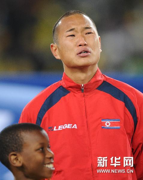 6月15日,朝鲜队球员郑大世在奏朝鲜国歌时泪流满面。当日,在2010南非世界杯小组赛G组比赛中,朝鲜队对阵巴西队。 新华社记者李尕摄