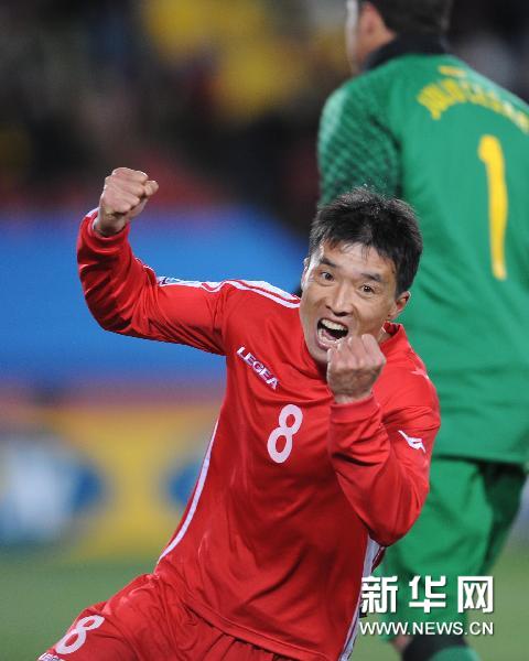 6月15日,朝鲜队球员池润南庆祝进球。当日,在2010南非世界杯小组赛G组比赛中,朝鲜队以1比2负于巴西队。 新华社记者李尕摄