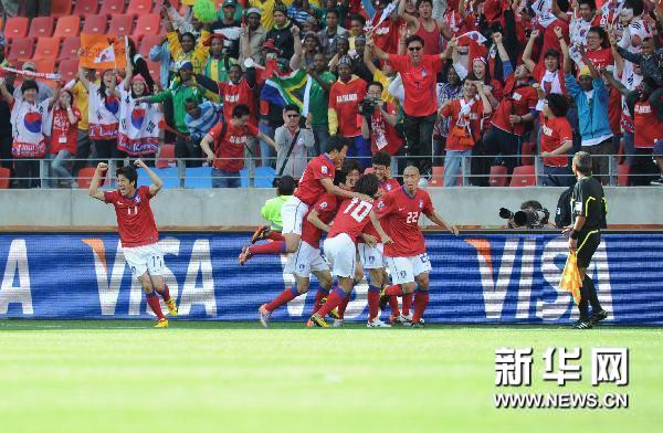 6月12日,韩国队球员庆祝进球。当日,在伊丽莎白港进行的2010南非世界杯B组小组赛中,韩国队2:0希腊队。 新华社记者陈海通摄