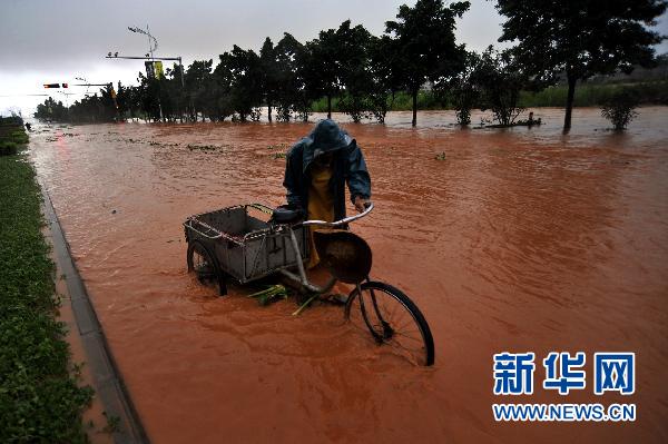 6月16日,一名市民在河源市建设大道上涉水前行。 6月14日至15日,广东省河源市普降大到暴雨,局部地区降下特大暴雨,造成河源市紫金、东源、源城3个县、区的34个乡镇受灾,受灾地区目前已派出武警部队和轻舟队转移受灾群众。新华社发(黄赞福 摄)