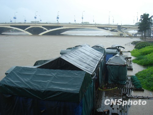 6月17日8时20分,桂林市气象局发布暴雨红色预警信号:桂林市区预计3小时雨量将达100毫米以上,且降雨可能持续。10时39分,桂林市区段漓江水位达到146米,超过警戒水位0.3米,预计下午16时,漓江水位将达到147.2米。图为停靠在桂林市解放桥下的鱼船。 中新社发 欧惠兰 摄