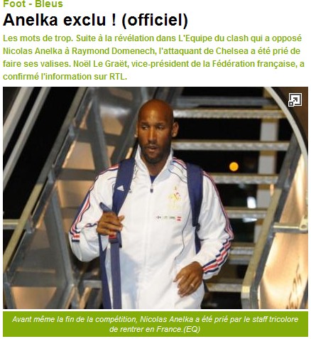 在法国队0-2不敌墨西哥之后,切尔西前锋阿内尔卡大骂球队主帅多梅内克,引起轩然大波。法国足协做出将他开除的决定,力度之大令人咋舌。法国足协官方声明称:法国足协主席皮埃尔要求阿内尔卡向主教练多梅内克道歉,但是后者拒绝了这样的要求。鉴于阿内尔卡辱骂教练的恶劣行径,在经过主教练多梅内克和足协官员讨论后,我们做出了将阿内尔卡开除出国家队的决定,他将在今天晚上离开法国队训练营。《队报》也在第一时间公布了阿内尔卡被国家队开除的消息。