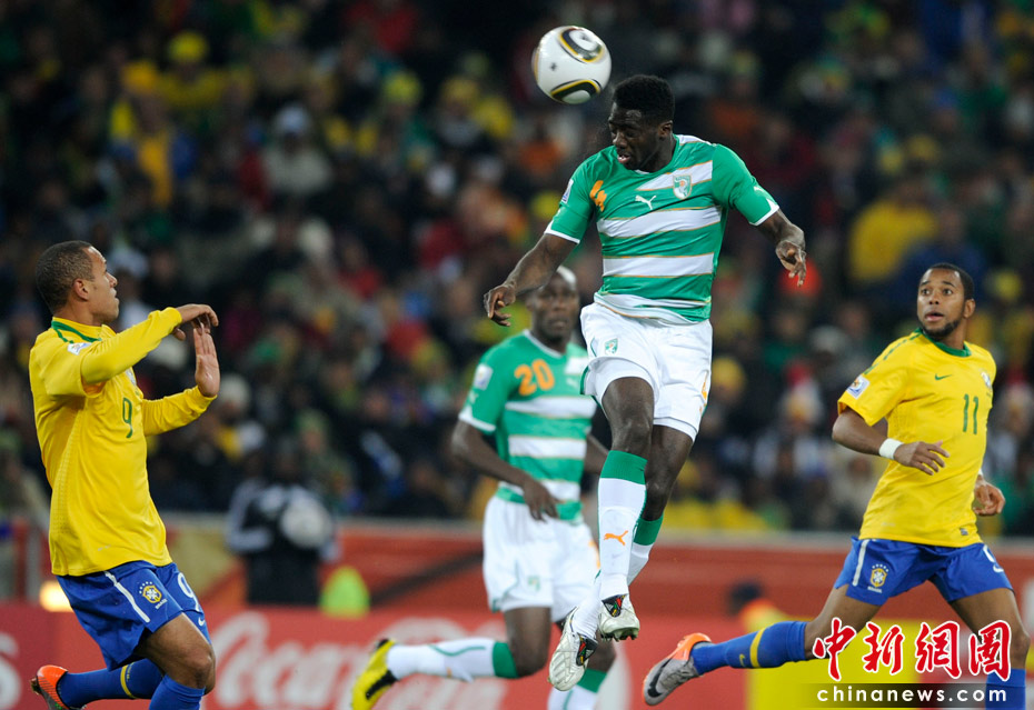北京时间6月21日凌晨进行的一场世界杯小组赛中,巴西队在约翰内斯堡足球城球场迎来了第二个对手科特迪瓦。最终凭借法比亚诺梅开二度和埃拉诺的进球,巴西3-1击败科特迪瓦。而在比赛进行到第88分钟时,卡卡因肘击对方球员,累计两张黄牌被罚下场。中新社记者 廖攀 摄
