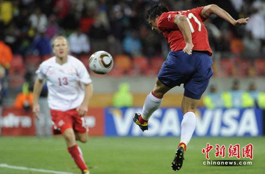 6月21日,世界杯H组第2轮首战在伊丽莎白港纳尔逊-曼德拉湾球场展开较量。瑞士中场贝赫拉米连续肘击两人,被红牌罚下后,以十人应战的他们在下半场被智利队冈萨雷斯打入一球,以0-1告负。