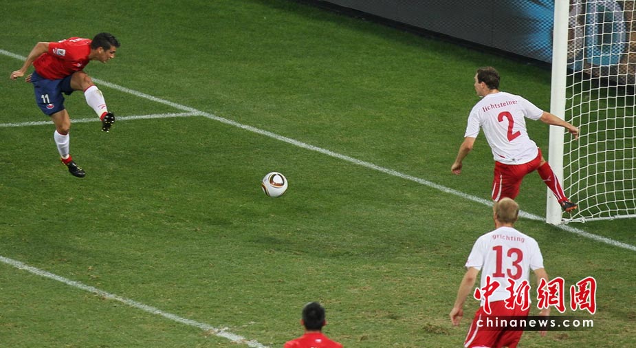 6月21日,世界杯H组第2轮首战在伊丽莎白港纳尔逊-曼德拉湾球场展开较量。瑞士中场贝赫拉米连续肘击两人,被红牌罚下后,以十人应战的他们在下半场被智利队冈萨雷斯打入一球,以0-1告负。