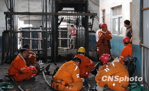 6月21日下午,几名救护队员在井口前小憩,等待下一轮搜索救援。当日凌晨1时40分左右,河南平顶山市卫东区兴东二矿发生井下火药爆炸事故,事故导致46人遇难。目前,已经初步确定爆炸的原因是由于火药自燃引起的,采矿许可证在2010年6月6日时已经到期。 中新社发 王中举 摄