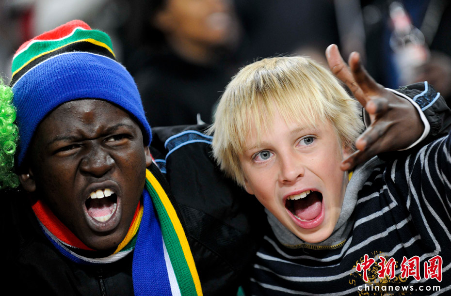 北京时间24日凌晨,世界杯小组赛D组迎来“决战之夜”。欧洲劲旅德国队在约翰内斯堡足球城体育场迎战加纳队。最终,凭借着中场球员厄齐尔的制胜一球,德国队1比0击败加纳队,两队携手进军16强。德国队三战2胜1负排名小组第一,他们在1/8决赛的对手将是老冤家英格兰队。加纳队小组第二出线,将与美国队争夺一个八强席位。图为赛场外的小球迷。中新社记者 廖攀 摄
