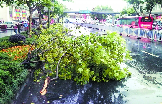 6月24日15时左右,杭城突降大暴雨,狂风刮断了延安路百大天桥附近的一棵行道树。本报记者叶寒青摄