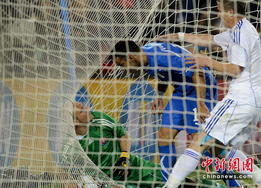 北京时间24日22时,世界杯F组小组赛继续打响,卫冕冠军意大利队迎战同样来自欧洲的斯洛伐克。比赛中,意大利队在落后2球的情况下,虽然奋力将比分追为2比3,但仍然被对手淘汰出局。中新社记者 廖攀 摄