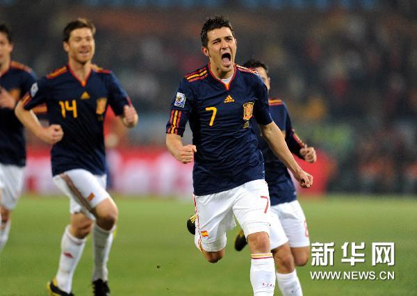 6月25日,西班牙队球员比利亚(前)在比赛中进球后庆祝。当日,在比勒陀利亚举行的2010南非世界杯H组比赛中,西班牙队2比1战胜智利队。新华社记者郭勇摄
