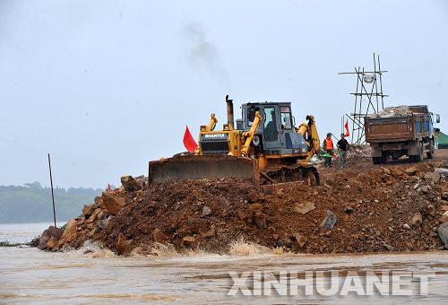 6月25日,推土机在唱凯堤一处决口填沙石。新华社记者章武摄