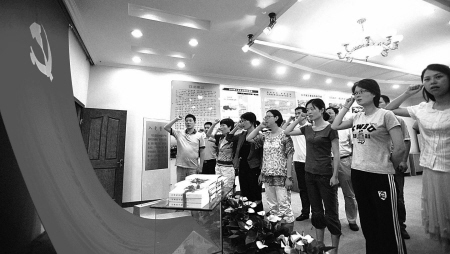 图为江北区党员服务中心组织年轻党员重温入党誓词。(丁安 摄)
