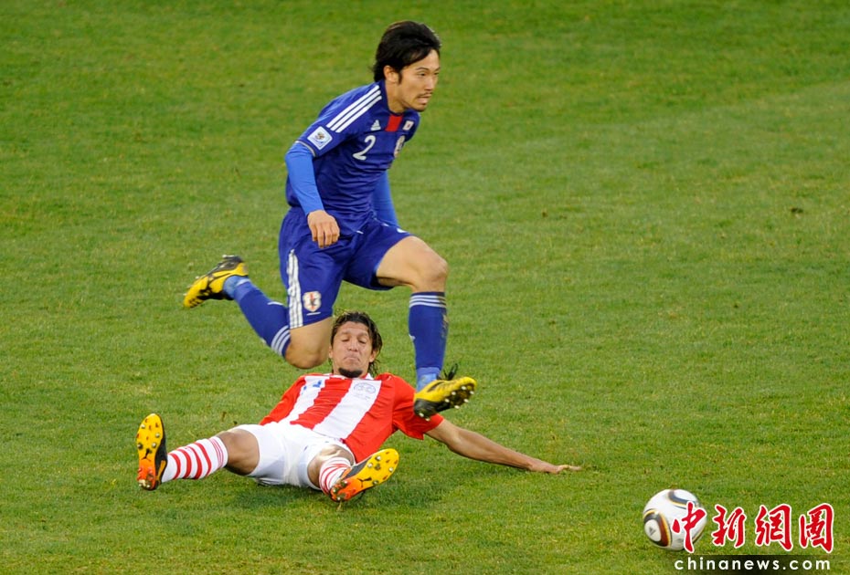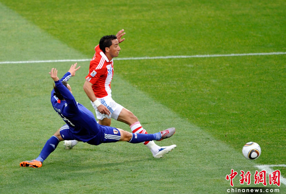 29日晚,南非世界杯1/8决赛第七场比赛比勒陀利亚的洛夫托斯球场拉开战幕,由巴拉圭队迎战日本队。120分钟比赛结束时,双方均没有建树,场上比分始终保持在0-0。在残酷的点球大战中,巴拉圭队五罚全中,以5-3击败日本,挺进八强。中新社记者 廖攀摄