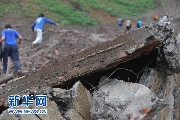 滑坡现场垮塌的房屋(6月29日摄)。 6月29日,贵州关岭“6·28”山体滑坡现场抢险救援工作仍在紧张进行。由于持续降雨导致滑坡现场山体仍有继续滑坡迹象,抢险救援面临很大困难。新华社记者欧东衢摄