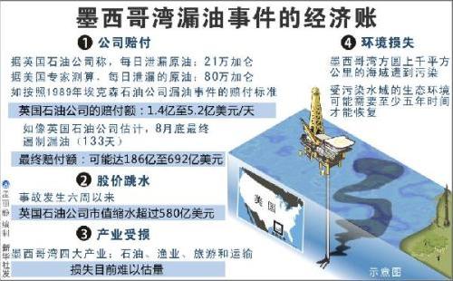 瑞士信贷银行说,英石油清理漏油和应对法律诉讼花费将累计370亿美元;高盛公司估计为330亿美元;雷蒙德—詹姆斯合伙公司分析师说,美国涉及环境案件的司法制度“更有利原告方”,英石油“账单”税后将接近630亿美元。