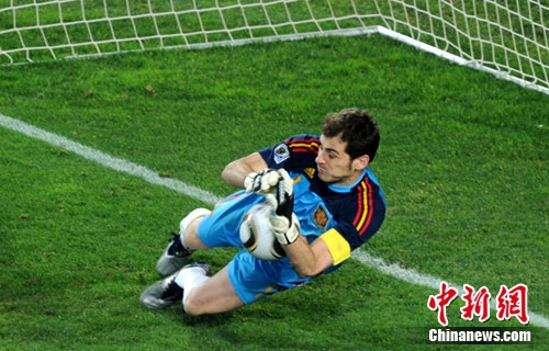 双方易地再战,巴拉圭仍然打得不急不躁,而西班牙队也始终拿不出好的办法,比赛继续在中场纠缠。第57分钟巴拉圭发动长传攻势,皮克用一个近乎于柔道的动作在禁区内拉倒高中锋卡多佐,被主裁判判罚点球,但操刀主罚的卡多佐射门又正又软,被卡西利亚斯死死地抱在怀里。