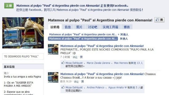 一个“如果阿根廷被德国淘汰,杀了章鱼‘保罗’”的小组,在脸谱网上成为了阿根廷球迷们热捧的对象。这个小组的名字,直接表明了球迷们的观点。但这并不能简单地表达阿根廷球迷们的愤怒,很多球迷们更是留言说要吃了章鱼。