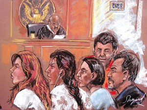 被捕嫌疑人在法庭受审的速写。