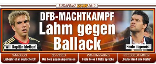 腾讯体育讯 德国与西班牙的半决赛恶战即将打响。恶战当头,德国队却传出不和谐的声音。7月6日凌晨,德国《图片报》头版头条披露,德国两大新老核心巴拉克、拉姆之间已经出现了不和。拉姆公开向巴拉克的队长权威发出了挑战。而巴拉克也离开了南非,不再观看德国队的比赛,选择回国。