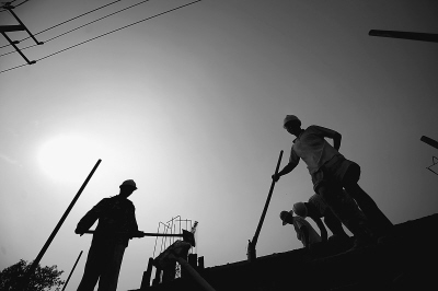 7月5日,山东济南烈日当空,在共青团路附近一处建筑工地,农民工依然坚守岗位。王锋摄(人民图片)