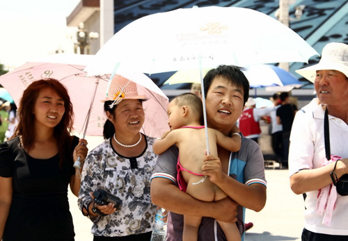 7月5日,来自河北的游客冒着高温在天安门广场游览。