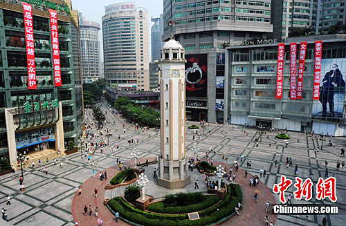 重庆渝中区最繁华的解放碑商圈两商场挂出条幅,庆贺文强被执行死刑。中新社发 郭晋嘉 摄